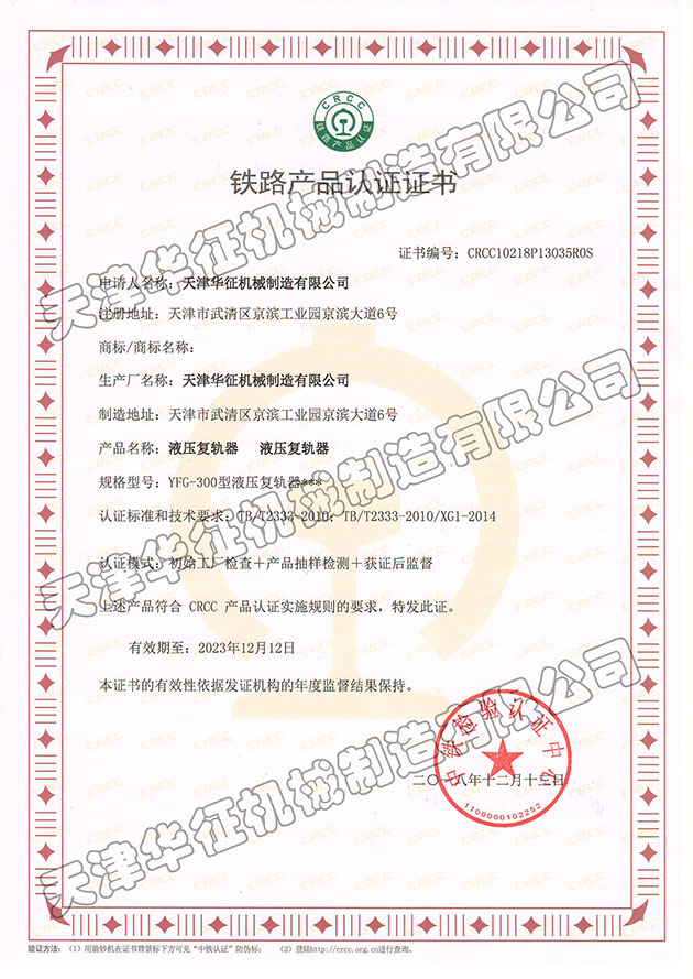 YFG-300型液压复轨器CRCC证书